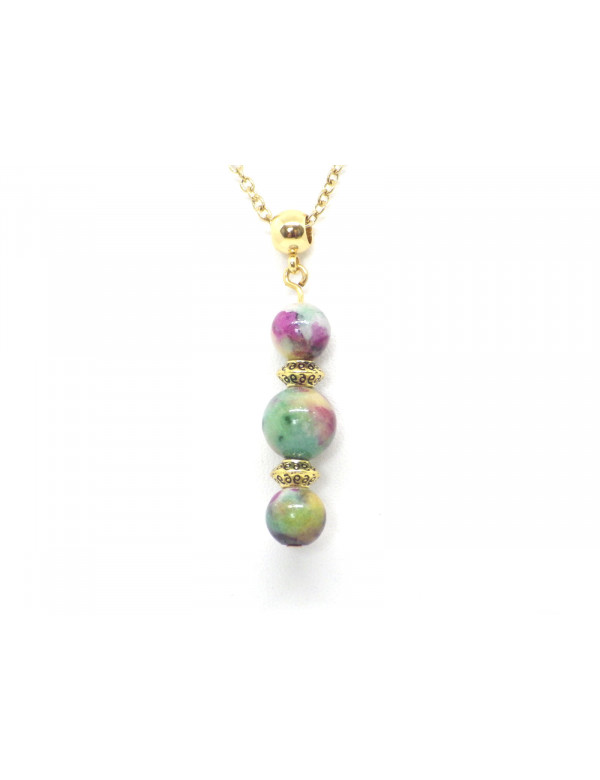 Chic and classic style golden stainless steel necklace with brown, red and green tinted white jade pendant