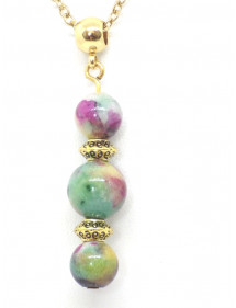 Very beautiful handcrafted necklace presented by ThurColas Création. Very elegant, this necklace is made of white jade beads tinted brown, red and green (semi precious stone) and Tibetan beads in gold metal. Everything is mounted on a stainless steel chain. Style: Classic chic, Ethnic, Bohemian Clasp: lobster claw Length: 55 cm Beads: 10 mm, 8 mm Materials: white jade tinted brown, red and green (semi-precious stone), metal and golden stainless steel Color: brown, green and red Metal color: Gold