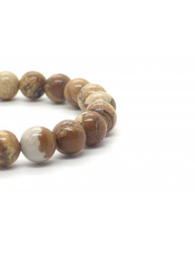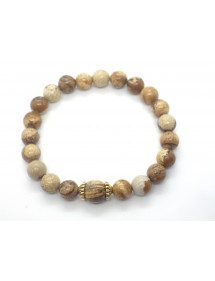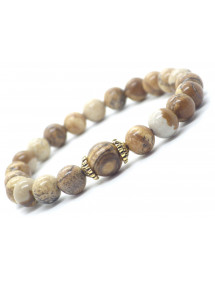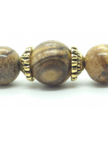 Magnifica creazione artigianale presentata da ThurColas Création, si tratta di un braccialetto da donna realizzato con perle di diaspro marrone naturale (pietra semipreziosa) decorato con coppe in metallo dorato. Il tutto è montato su un filo elastico di qualità. Stile: Classico, chic, etnico, bohémien Lunghezza: 19 cm Perline: 10 mm Materiali: diaspro marrone (pietra semipreziosa), metallo dorato Colore: marrone Colore del metallo: oro