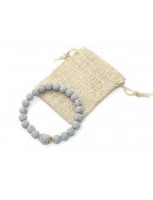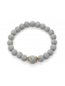 Magnifica creazione artigianale presentata da ThurColas Creation, si tratta di un braccialetto da donna realizzato con perle di pietra lavica naturale grigia (pietra semipreziosa) decorato con coppe in metallo dorato. Il tutto è montato su un filo elastico di qualità. Stile: Classico, chic, Etnico, Bohémien Lunghezza: 19 cm Perline: 10 mm Materiali: pietra lavica grigia (pietra semipreziosa), metallo dorato Colore: grigio Colore metallo: Oro