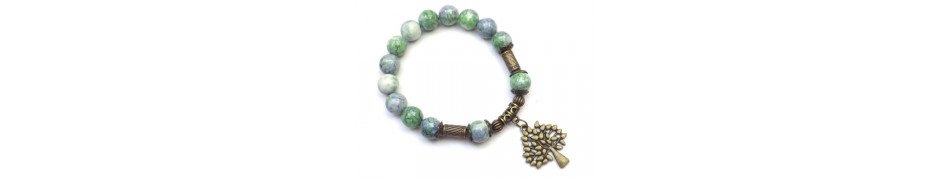 16,50 €ThurColas ti propone un braccialetto artigianale molto originale dal look vintage composto da perline di giada bianca naturale colorate di verde rosso e bianco e perline di metallo bronzo antico. Poiché le perle di giada bianca sono colorate in modo casuale potrebbero esserci lievi differenze rispetto al modello mostrato nella fotografia. Il tutto è montato su un filo elastico e decorato con un charm a forma di albero. Stile: Boemo Vintage Etnico tribale Lunghezza: 190 mm Perline: 10 mm Materiali: Giada bianca naturale tinta di rosso con sfumature di verde bronzo Colore: Verde rosso marrone bianco bronzo Colore del metallo: Bronzo antico