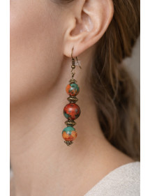 Orecchini Thurcolas in perle di giada bianca naturale colorata in marrone arancione e blu e perle tibetane pendenti