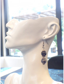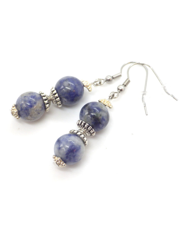 Magnifica creazione artigianale presentata da ThurColas Creation, si tratta di orecchini realizzati con perle di diaspro blu naturale (pietra semipreziosa) impreziositi da perline tibetane e coppe in metallo argentato. Il tutto è montato su ganci francesi. Stile: Classico, chic, etnico, bohémien Gancio: Francese Altezza: 50 mm Perline: 10 mm Materiali: diaspro blu (pietra semipreziosa), acciaio inossidabile, metallo argentato Colore: blu Colore del metallo: argento, acciaio