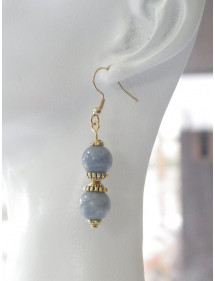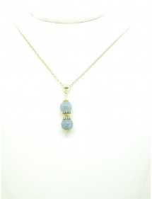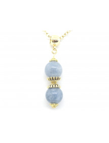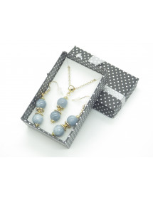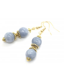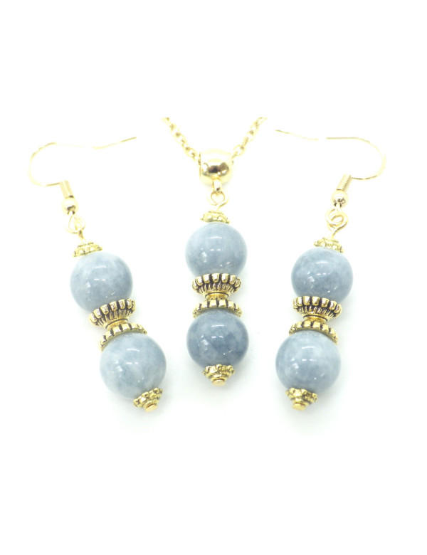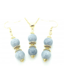 Magnifique création artisanale présentée par ThurColas Création, il s'agit d'un ensemble de bijoux composé de boucles d'oreille et d'un collier en acier inoxydable avec pendentifs constitués de perles naturelles en quartz bleu (pierre semi précieuse) agrémenté de perles tibétaines et coupelles en métal doré. Style : Classique, chic, Ethnique, Bohême Hauteur pendentif : 50 mm Longueur collier : 45 cm Hauteur Boucles d'oreille : 50 mm Crochets : French Perles : 10 mm Matériaux : Quartz bleu (pierre semi précieuse), acier inoxydable plaqué or, métal doré Couleur : bleu Couleur du métal : Or, doré