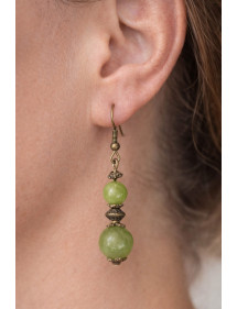 Bellissima creazione artigianale presentata da ThurColas Creation, si tratta di orecchini realizzati con perline di giada verde taiwanese naturale (pietra semipreziosa) impreziosite da perline tibetane e coppe in ottone bronzo antico. Il tutto è montato su ganci francesi in ottone. Perfettamente bilanciati con un'altezza totale di 50 mm e un pendente di 35 mm, questi orecchini leggeri e confortevoli sono progettati per essere eleganti e facili da indossare. Stile: Classico, Chic, Etnico, Bohémien Uncinetto: Francese Altezza: 50 mm Perline: 10 mm e 8 mm Materiali: Giada verde di Taiwan (pietra semi preziosa), ottone, bronzo antico Colore: Verde Metallo Colore: Bronzo