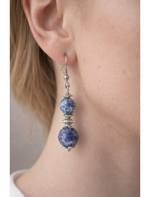 Bellissima creazione artigianale presentata da ThurColas Creation, si tratta di orecchini in acciaio inossidabile realizzati con perline di diaspro imperiale blu naturale (pietra semipreziosa) impreziosite da perline tibetane e perline in ottone argentato. Il tutto è montato su ganci francesi in acciaio inossidabile. Perfettamente bilanciati con un'altezza totale di 50 mm e un pendente di 35 mm, questi orecchini leggeri e confortevoli sono progettati per essere eleganti e facili da indossare. Stile: Classico, chic, etnico, bohémien Uncinetto: francese Altezza: 50 mm Perline: 10 mm e 8 mm Materiali: diaspro imperiale blu (pietra semi preziosa), ottone, acciaio inossidabile Colore: blu, bianco Colore del metallo: acciaio, argento