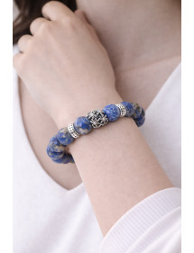Magnifica creazione artigianale presentata da ThurColas Création, si tratta di un bracciale da donna realizzato con perle di diaspro imperiale blu naturale (pietra semipreziosa) impreziosite da una perla centrale con cristalli. Il tutto è montato su un filo elastico di qualità. Stile: Classico, Chic, Etnico, Bohémien Lunghezza: 19 cm Perline: 10 mm Materiali: Diaspro imperiale blu (pietra semi preziosa), Metallo argentato, Cristallo Colore: Blu, Bianco Colore metallo: Argento Le nostre perle sono realizzate in vero diaspro imperiale blu e assemblate su un filo elastico di qualità molto resistente, essendo il diaspro imperiale una pietra naturale, ogni perla è unica nel colore quindi potrebbero esserci lievi differenze con il modello presentato, ogni modello è infatti unico. Questo gioiello viene fornito con un sacchetto regalo.