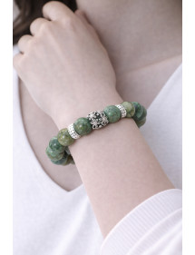 Magnifica creazione artigianale presentata da ThurColas Création, si tratta di un bracciale da donna realizzato con perle turchesi verdi naturali (pietra semipreziosa) impreziosite da una perla centrale con cristalli. Il tutto è montato su un filo elastico di qualità. Stile: Classico, chic, etnico, bohémien Lunghezza: 19 cm Perline: 10 mm Materiali: Verde turchese (pietra semi preziosa), metallo argentato, cristallo Colore: verde Colore del metallo: Argento
