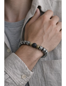 Bellissimo bracciale da uomo realizzato con cura nei nostri laboratori in Francia. Questo braccialetto è composto da bellissime perline di ematite nera e cromata naturale, perline di agata nera e graziose perline tibetane in ottone bronzo antico. È la forza del metallo che risplende in questo modello. Stile: Etnico, Bohémien, tribale, Zen Lunghezza: 210 mm Perline: 10 mm Materiali: ematite (pietra semipreziosa), ottone agata nera Colore: nero, cromo Colore del metallo: Bronzo antico