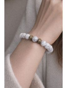 Bellissimo bracciale da donna realizzato con cura nei nostri laboratori in Francia. Questo braccialetto è composto da bellissime perline di howlite bianche naturali e perline tibetane molto carine in ottone bronzo antico. È la forza del metallo che risplende in questo modello. Stile: Etnico, Bohémien, Tribale, Zen Lunghezza: 190 mm Perline: 10 mm Materiali: Howlite bianca (pietra semipreziosa), Ottone Colore: Bianco, Metallo Colore: Bronzo antico Superbo braccialetto composto da perline di howlite bianche naturali (pietra semipreziosa) e perline tibetane in ottone, il tutto montato su un filo elastico di qualità. Questo gioiello viene fornito con un sacchetto regalo color oro gratuito.