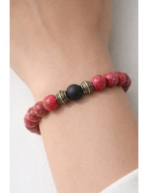Bellissimo bracciale da donna realizzato con cura nei nostri laboratori in Francia. Questo braccialetto è composto da bellissime perle di diaspro imperiale rosso naturale, perline di agata nera e graziose perle tibetane in ottone bronzo antico. È la forza del metallo che risplende in questo modello. Stile: Etnico, Bohémien, tribale, Zen Lunghezza: 190 mm Perline: 10 mm Materiali: diaspro imperiale (pietra semipreziosa), agata di ottone nero Colore: rosso, nero Colore del metallo: Bronzo antico