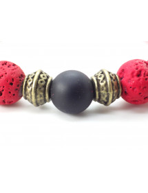 Bellissimo bracciale da donna realizzato con cura nei nostri laboratori in Francia. Questo braccialetto è composto da bellissime perle di pietra lavica rossa naturale, perline di agata nera e graziosissime perle tibetane in ottone bronzo antico. È la forza del metallo che risplende in questo modello. Stile: Etnico, Bohémien, Tribale, Zen Lunghezza: 190 mm Perline: 10 mm Materiali: Pietra lavica (pietra semipreziosa), Agata nera Ottone Colore: Rosso, Nero Colore del metallo: Bronzo antico