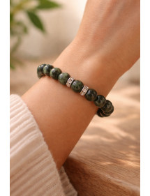 Una bellissima creazione artigianale presentata da ThurColas Création, questo è un braccialetto da donna realizzato con perline di giada verde taiwanese naturale (pietra semipreziosa) impreziosite da perline in acciaio inossidabile incastonate di cristalli. Il tutto è montato su un filo elastico di qualità. Stile: Classico, Chic, Etnico, Bohémien Lunghezza: 19 cm Perline: 10 mm Materiali: Giada verde di Taiwan (pietra semi preziosa), acciaio inossidabile, cristallo Colore: verde Colore metallo: argento