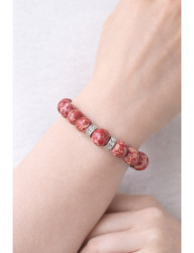 Una bella creazione artigianale presentata da ThurColas Création, questo è un braccialetto da donna realizzato con perle di diaspro imperiale rosso naturale (pietra semipreziosa) impreziosite da perline di acciaio inossidabile incastonate con cristalli. Il tutto è montato su un filo elastico di qualità. Stile: Classico, Chic, Etnico, Bohémien Lunghezza: 19 cm Perline: 10 mm Materiali: Diaspro imperiale rosso (pietra semi preziosa), acciaio inossidabile, cristallo Colore: rosso, bianco Colore metallo: argento
