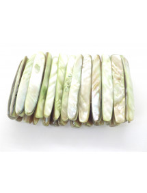 Questo ampio bracciale in conchiglia verde cattura immediatamente l'attenzione con i suoi riflessi perlati e le delicate sfumature di verde chiaro, oliva e beige. Ogni pezzo è ricavato da una conchiglia naturale e poi tinto a mano, creando un sottile gioco di trasparenze e luci.