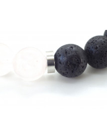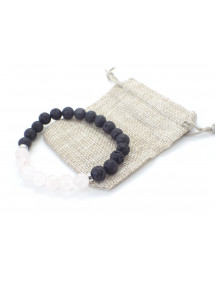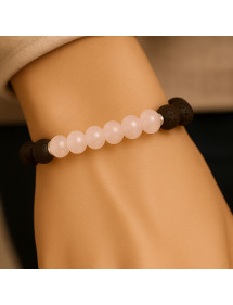 Questo bracciale è composto da perle naturali da 8 mm che alternano sette perle traslucide di quarzo rosa e perle di pietra lavica nera. Due dischi in acciaio inossidabile fungono da separatori per enfatizzare la transizione tra le pietre. Lungo 19 cm, il tutto è montato su un robusto filo elastico che garantisce flessibilità e supporto. Il contrasto tra la consistenza porosa della lava e la delicata lucentezza lattiginosa del quarzo rosa crea una finitura armoniosa e resistente. Ogni bracciale è assemblato a mano nel nostro laboratorio in Angiò, utilizzando il know-how artigianale francese che presta attenzione alle finiture.