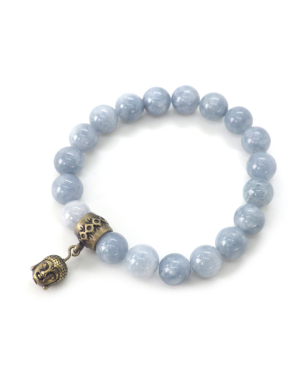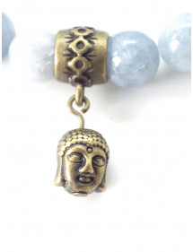 Bracciale in quarzo blu naturale dal Brasile con testa di Buddha in ottone bronzo - 10 mm - 19 cm