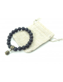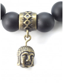 Bracciale in agata nera smerigliata naturale dal Brasile con testa di Buddha in ottone bronzo - 10 mm - 19 cm