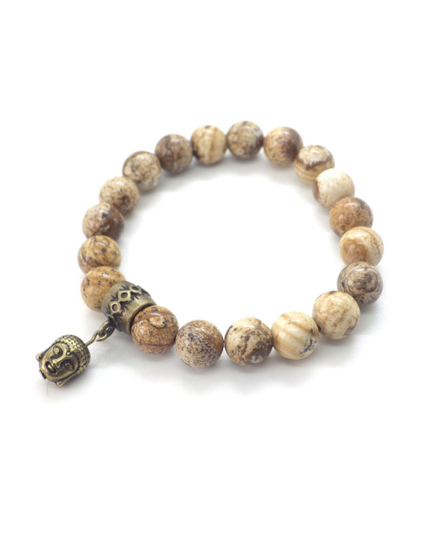 Bracciale in diaspro marrone naturale dall'Indonesia con testa di Buddha in ottone bronzo – 10 mm – 19 cm