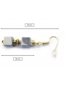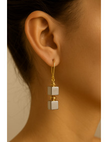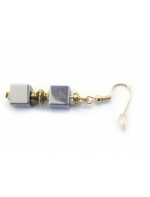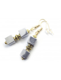 Questi eleganti orecchini combinano la semplicità geometrica dei cubi di ematite naturale con il caldo bagliore delle finiture placcate oro. Le perle cubiche sono incorniciate da delicate coppette traforate in ottone placcato oro, sospese da ganci placcati oro 18 carati. Il loro design raffinato aggiunge un tocco chic e contemporaneo, perfetto per impreziosire un outfit elegante o casual. Ogni paio è realizzato a mano nel nostro laboratorio ad Anjou, in Francia.