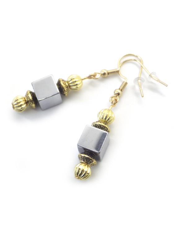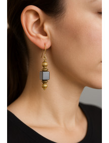 Questi orecchini combinano la potenza minerale dell'ematite naturale con la calda eleganza dell'oro. I cubi di ematite sono incorniciati da perle scanalate in oro e distanziatori cesellati per un look raffinato e armonioso. Montati su ganci standard in oro, offrono una silhouette equilibrata, chic e senza tempo. Realizzati a mano nel nostro laboratorio in Angiò, questi orecchini riflettono l'artigianato francese che fonde autenticità e modernità.