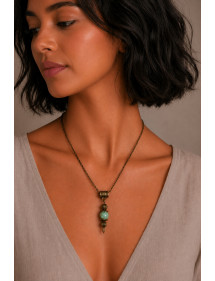 Magnifica collana vintage in bronzo antico. Realizzata artigianalmente, questa collana con pendente è realizzata con cura e composta da turchese blu ricostituito (pietra semipreziosa) e bronzo antico. Il tutto è montato su una catena di bronzo antico. Stile: bohémien, vintage Chiusura: artiglio di aragosta Altezza ciondolo: 30 mm Lunghezza catena: 43 cm Perline: turchese ricostituito blu (pietra semipreziosa) Materiali: bronzo antico Colore: blu Colore metallo: bronzo antico Le nostre perle sono ricostituite in turchese, colorate e assemblate su un'asta di bronzo, il processo di tintura è casuale, ogni perla è unica nel colore quindi potrebbero esserci leggere differenze con il modello presentato, ogni modello è infatti unico. Questo gioiello viene fornito con una custodia regalo color oro gratuita.